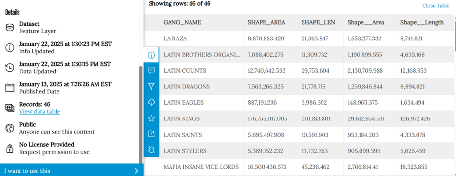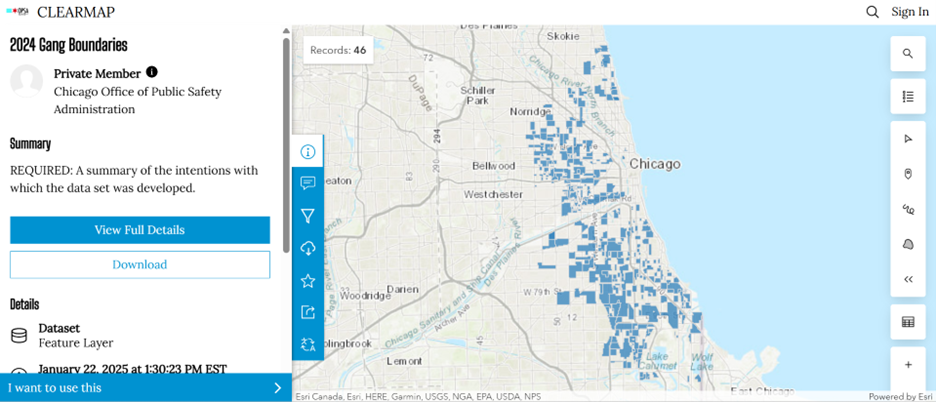 Chicago Gang Territory Boundaries (2024): Gang territory data from 2024 was sourced from the Chicago Police Department’s GIS portal (Figure 3). These boundaries depict areas of known gang influence and were integrated into the spatial database to support comparative analysis with neighbourhood-level census indicators.