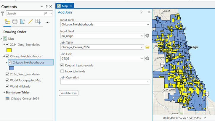 Once the data was downloaded, they were applied to software to visualize the data. A combination of technologies was used, ArcGIS Pro and Sketchup (Web). ArcGIS Pro was used to import all boundary files, where neighbourhood census data was joined to Chicago boundary shapefile using unique identifier such as Neighbourhood Name (Figure 4).
