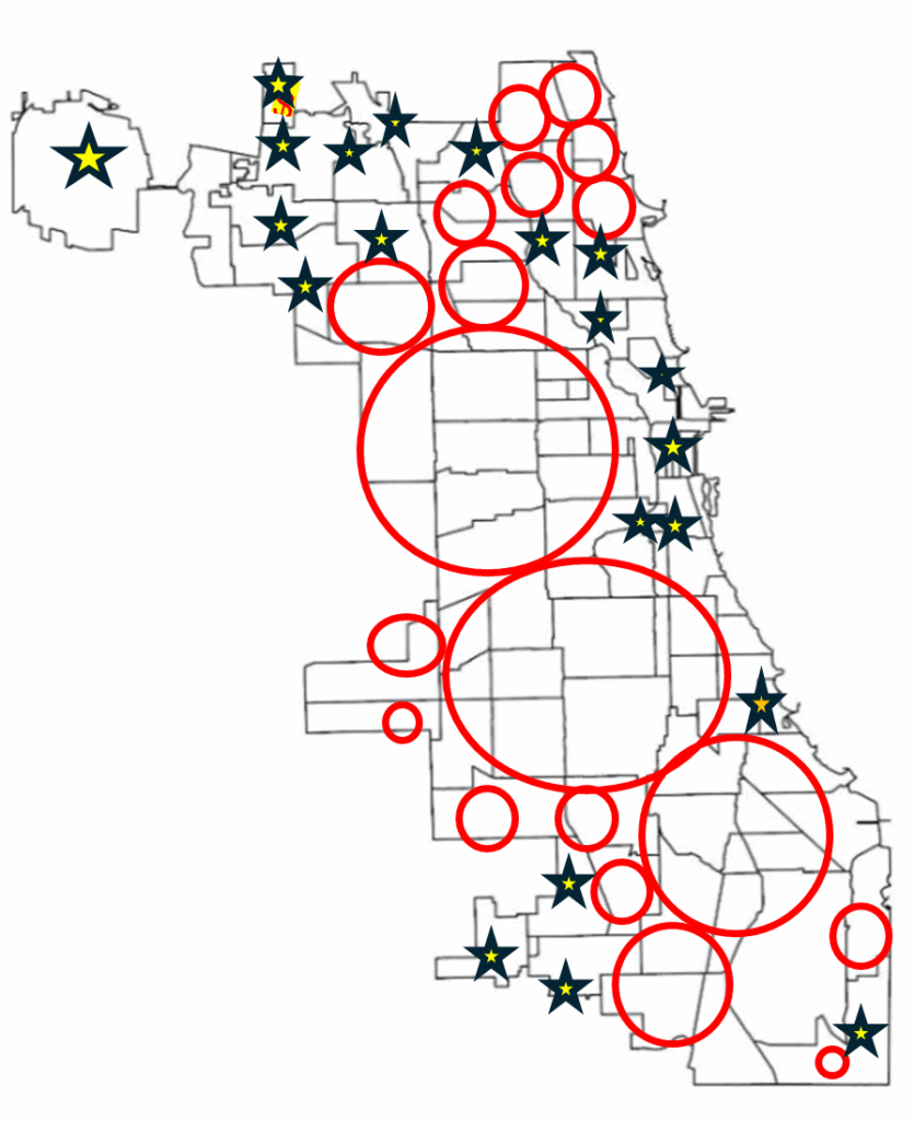 Within ArcGIS Pro, the combined map of both boundaries allowed for analysis of the neighbourhoods with the most gang boundaries. Rough sketch of these neighbourhoods was made by circling the neighbourhoods of a clean map of Chicago, where the bigger circles show the areas with more gang areas and the stars indicate the neighborhoods with no gang boundaries (Figure 6). The CMAP was used to look at the demographics of the neighborhoods with the most area of gangs and compared to the areas with no gang areas (e.g. O’Hare).