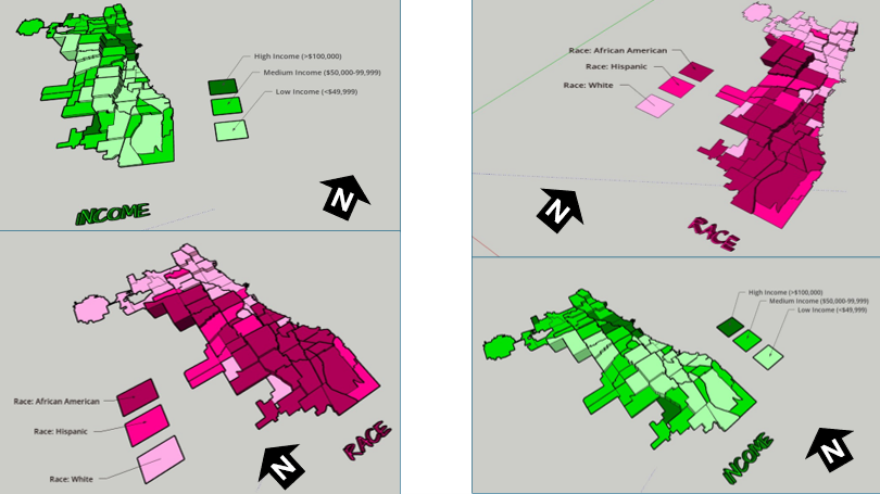 Determined what demographic factors were going to be used to compare with gang areas, for example, income, race, and top 3 gangs (Gangster Disciples, Black P Stones, and Latin Kings). Two elements present with the two demographic maps (height and colour), where colour indicates the demographic factor and the height represents the gang presence (Figure 7).