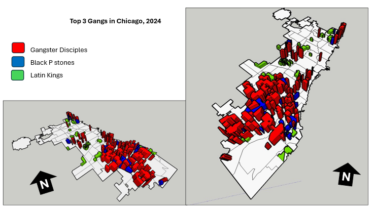 A different approach was applied to the top 3 gangs map model, where the highest remains same in each gang, but are placed in the neighbourhoods that have that gang present. For instance, Gangster Disciples were set at approximately 5 feet (5′ 3/16″ or 1528.8 mm), Black P Stones at almost 4 feet (3′ 7/8″ or 936.6 mm), and Latin Kings at a little over 1 foot (1′ 8 1/4″ or 514.4 mm).