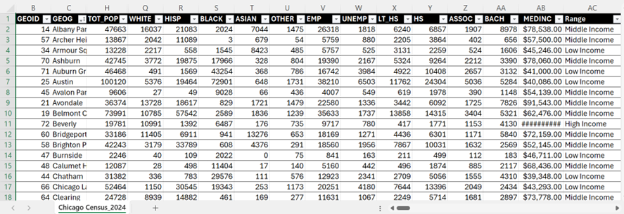 Chicago Neighbourhood Census Data (2025): Over 200 socioeconomic and demographic data for each neighbourhood was obtained from the Chicago Metropolitan Agency for Planning (CMAP) (Figure 1). In July 2025 their Community Data Snapshot portal released granular insights into population characteristics, income levels, housing, education, and employment metrics across Chicago’s neighbourhoods.