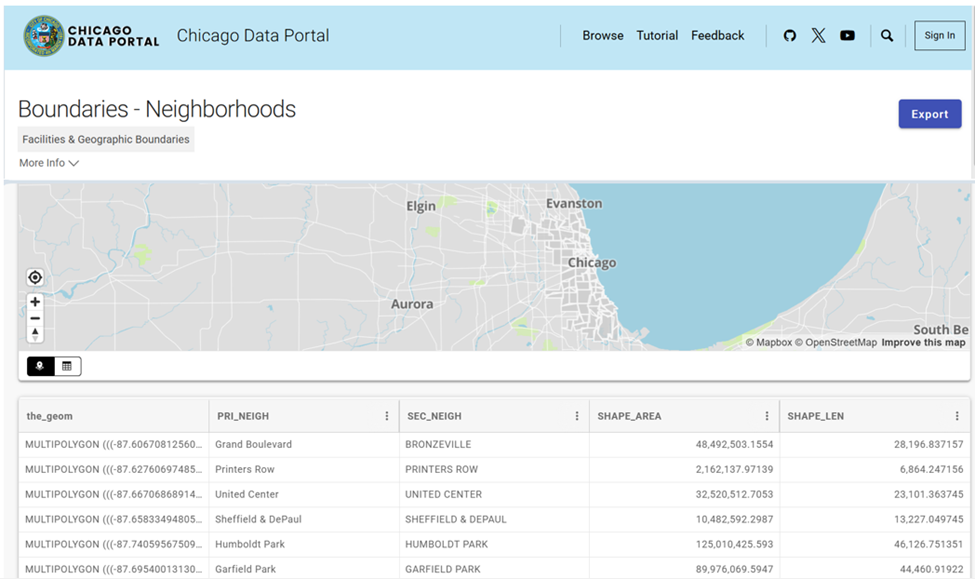 Chicago Neighbourhood Boundary Files: official geographic boundaries for Chicago neighbourhoods were downloaded from the City of Chicago’s open data portal (Figure 2). These shapefiles were used to spatially join census data and support geospatial visualization.