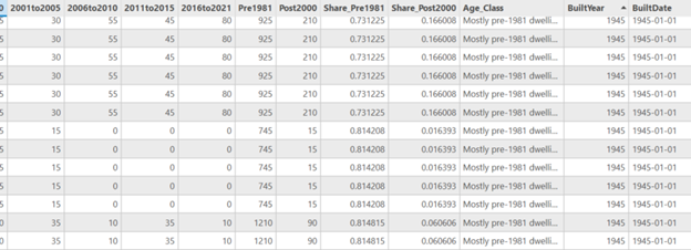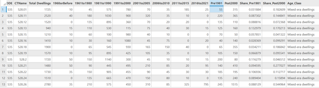 • Because Toronto does not have building-year data, I assigned construction era categories from the census as proxies for building age, and created an age classification system using proportions. Adding periods and dividing / total dwellings to get proportions, and assigned them into three classes: