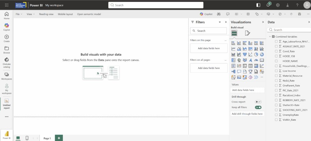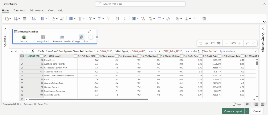 To create a new report in Power BI, you need a set of data to start. For this analysis, we will use neighbourhood level socio-demographic data in an excel format. This data includes total population and variables that are often associated with marginalized communities including low income, unemployment rates, no education and visible minorities rates. This data does not have spatial reference, however, the neighbourhood name and unique identifier is available in the data.