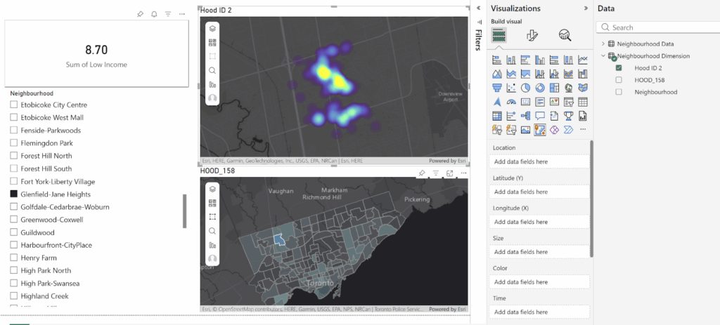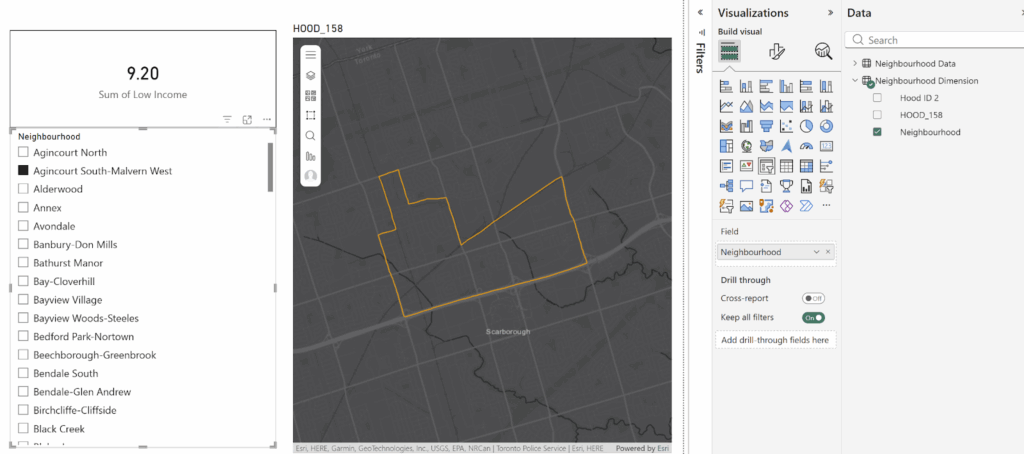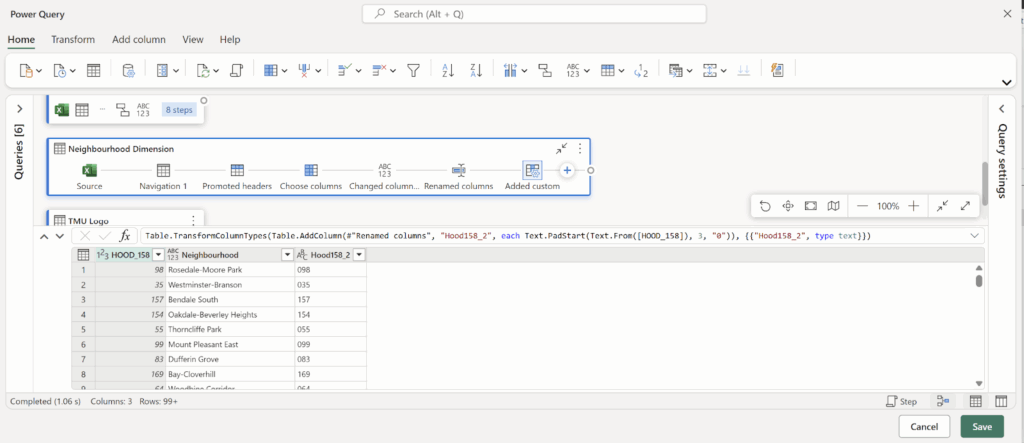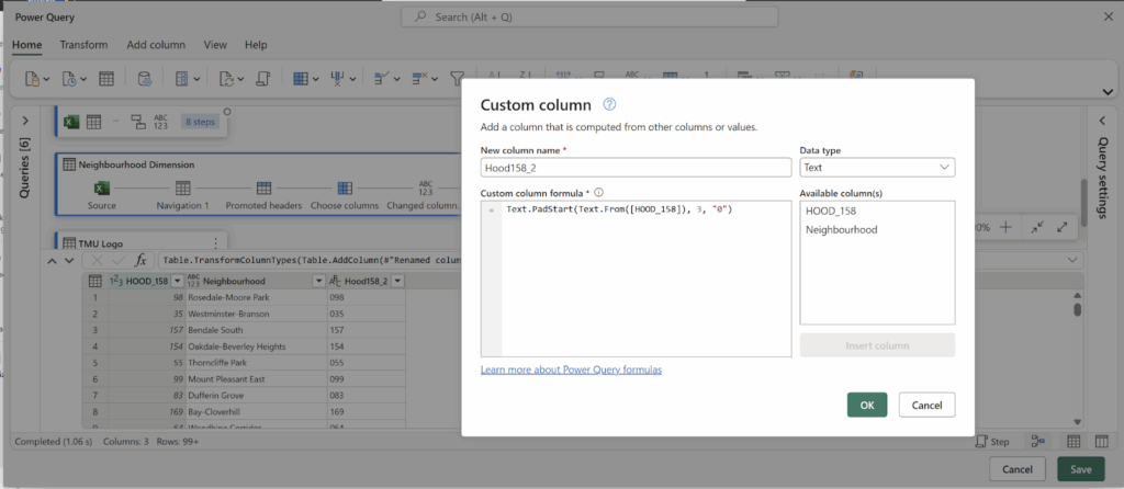 The custom column and formula takes the HOOD ID, changes it into a text field and adds padding of zeros. This will match the neighbourhood ID format in the shootings and firearm discharge data. Keep in mind, the only data you can manipulate is the data within your semantic model. You cannot change or manipulate the data sourced from ArcGIS Online.