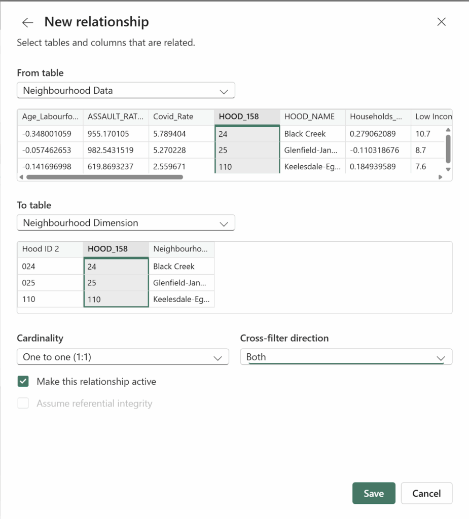 Congrats! We created a clean table that will function as a neighbourhood dimension table to facilitate data joins. We also learned how to establish a relationship with other tables in your semantic model. This comes handy as you can integrate multiple sources of data.