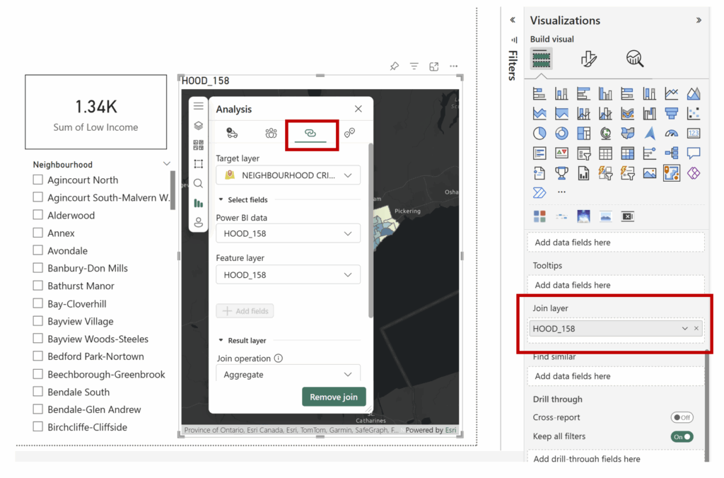 Click on the ArcGIS Visual > Analysis Tab > Join Layer > Target Layer > Power BI Data (Drag & Drop Hood ID into the Join Layer Field in the Visualization Pane > Additional Options will now Appear on the Map> Select Join Field > Join Operation Aggregate > Interaction Filter > Create Join > Close