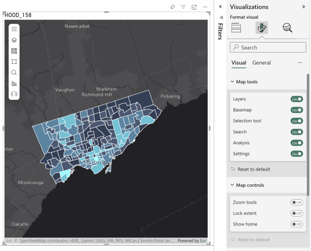 When you have the ArcGIS visual selected, you have the ability to customize your settings using the visualization panel. This controls the map tools available in the report. This can come in handy when setting up a default extent in your map for this report or allowing users to have control over the map.
