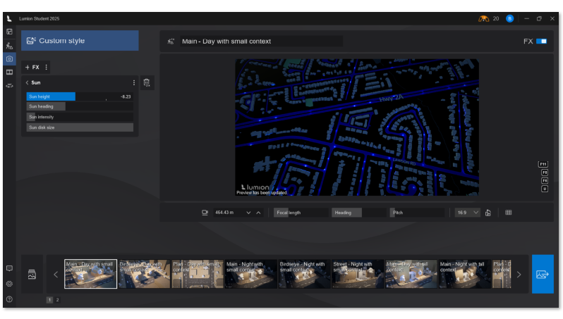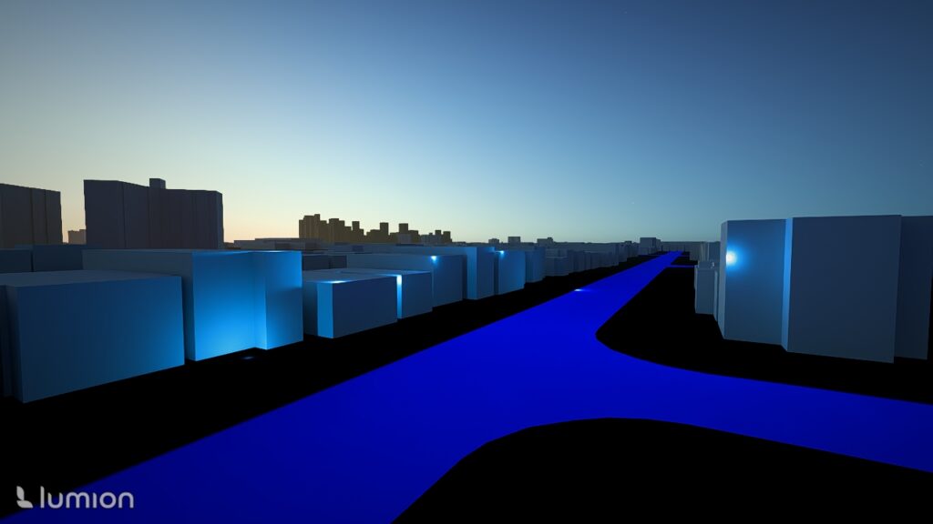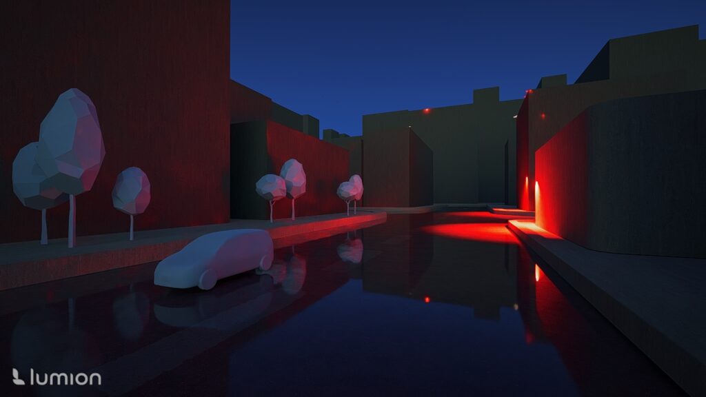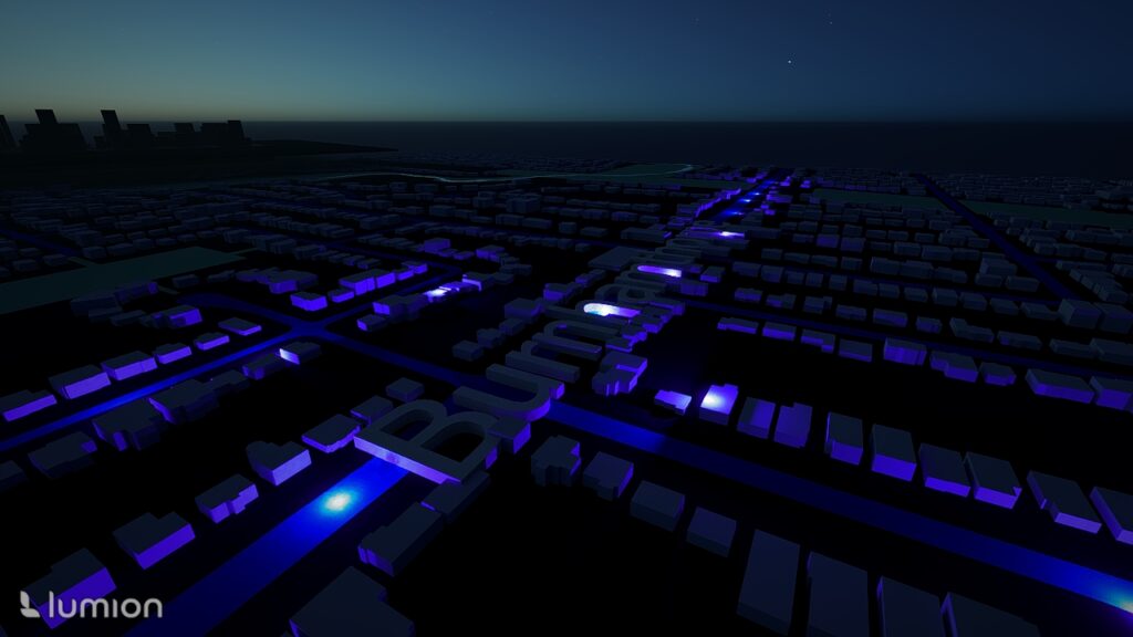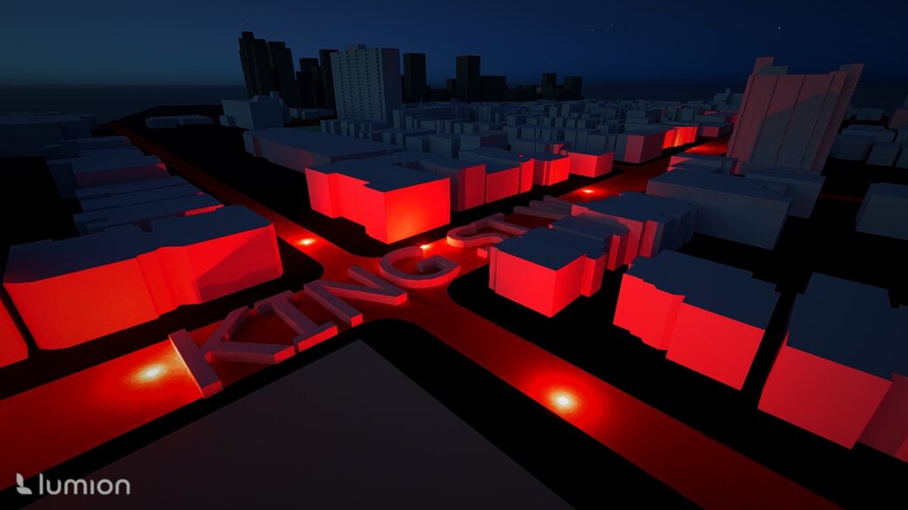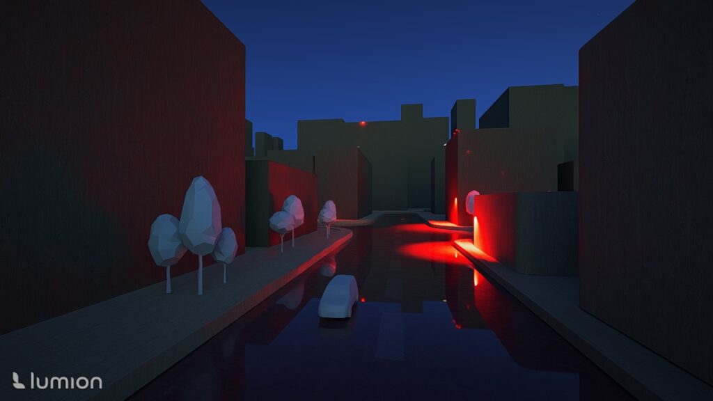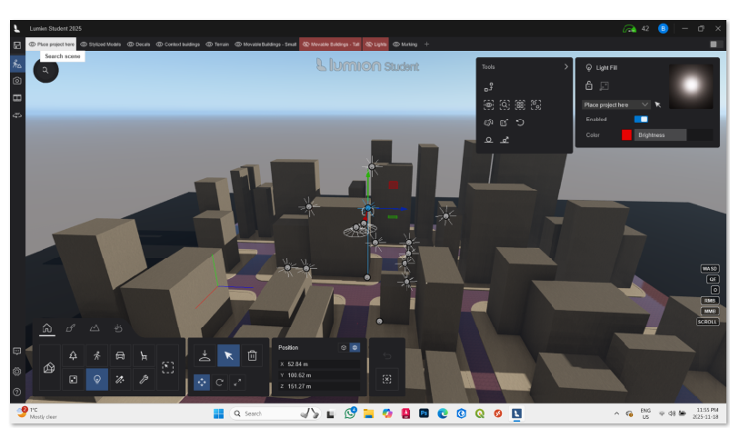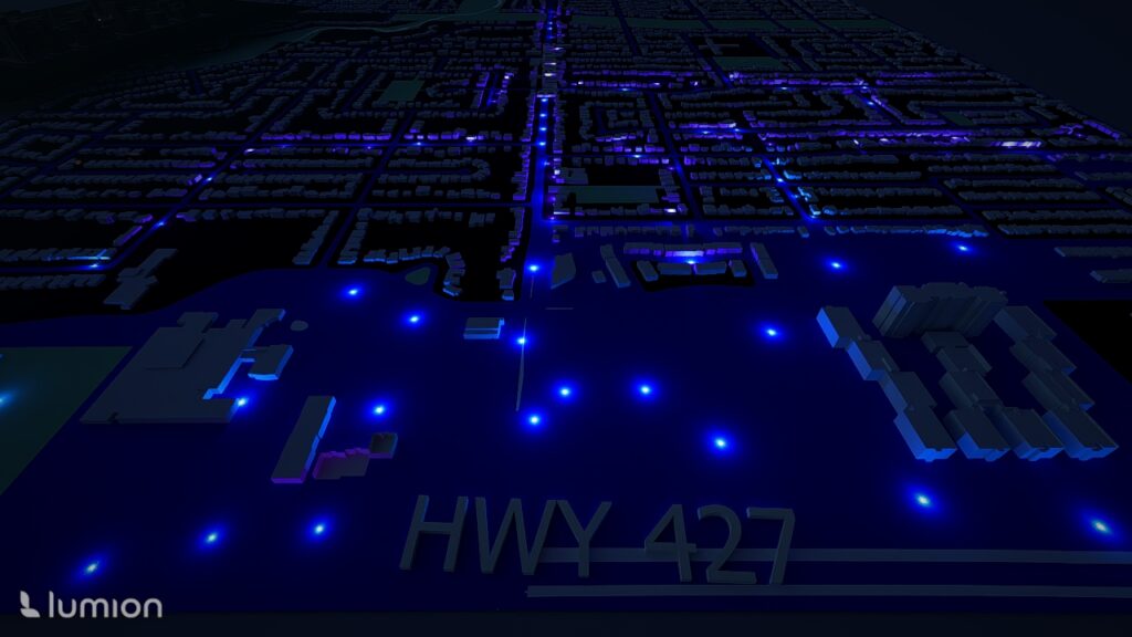 Adding Atmospheric Lighting: Because this visualization focuses on highlighting hotspot intensities, I chose a night time scene: which then i reduced sunlight intensity. Added Spotlights added at various heights Colours represented collision intensity: Blue = lower-risk area, Red = high collision zones