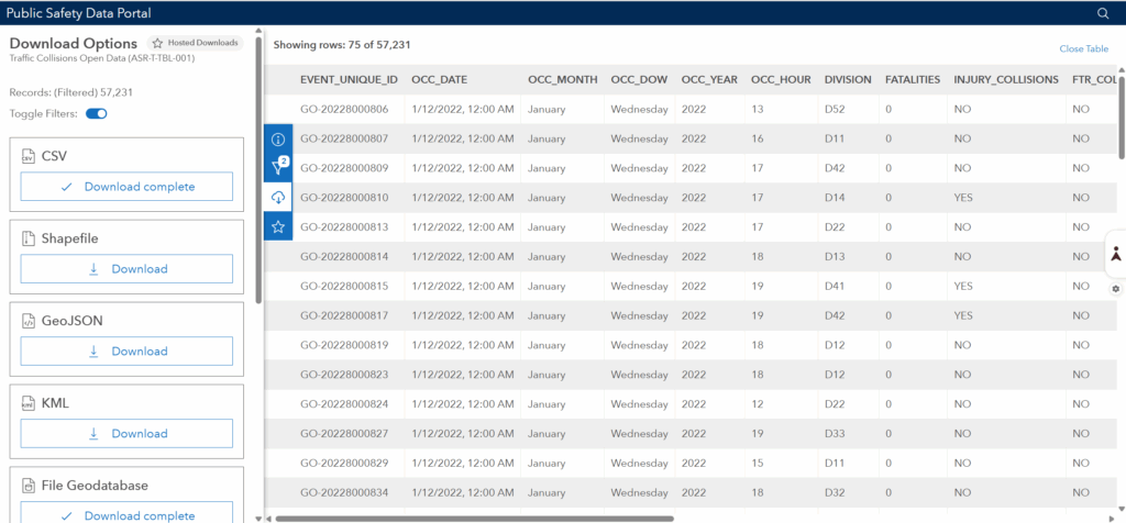 This dataset includes over 770,000 collision records across many years. Each record includes: Location, Date, time, collision type, mode invloved and different attributes. Because the full dataset is extremely large and includes COVID-period anomalies, I filtered the dataset to only the year 2022. This produced roughly 50,000-60,000 collision records. For this project, only automobile collisions were used. I downloaded the geodatabase file as a CVS.
