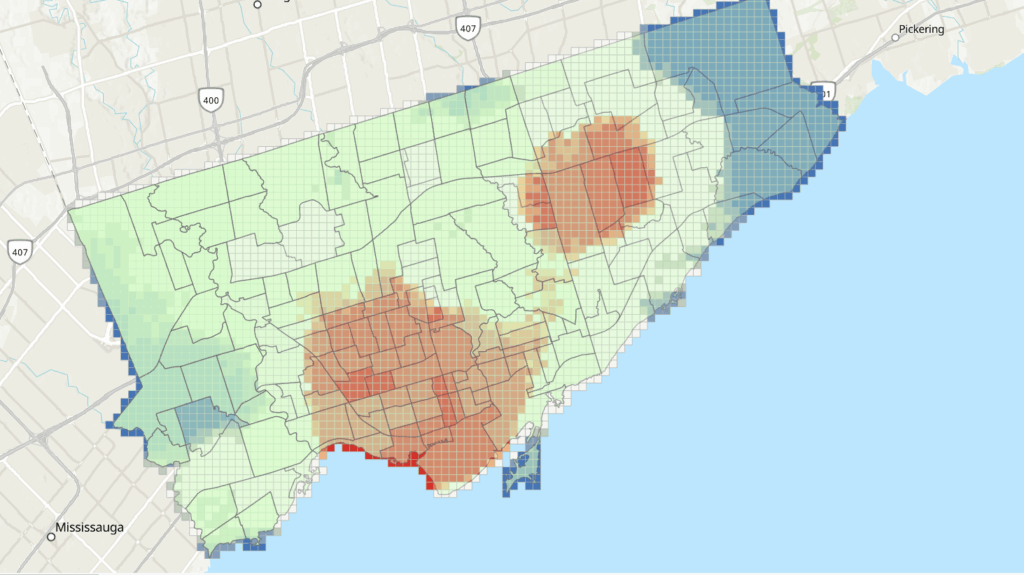 Areas such as St. Lawrence–East Bayfront–Islands, Harbourfront–CityPlace, Fort York–Liberty Village, and West Queen West showed extremely high collision densities