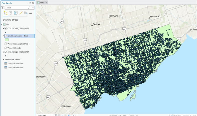 To understand spatial distribution, I joined the collision points to Toronto’s 158 neighbourhood polygons