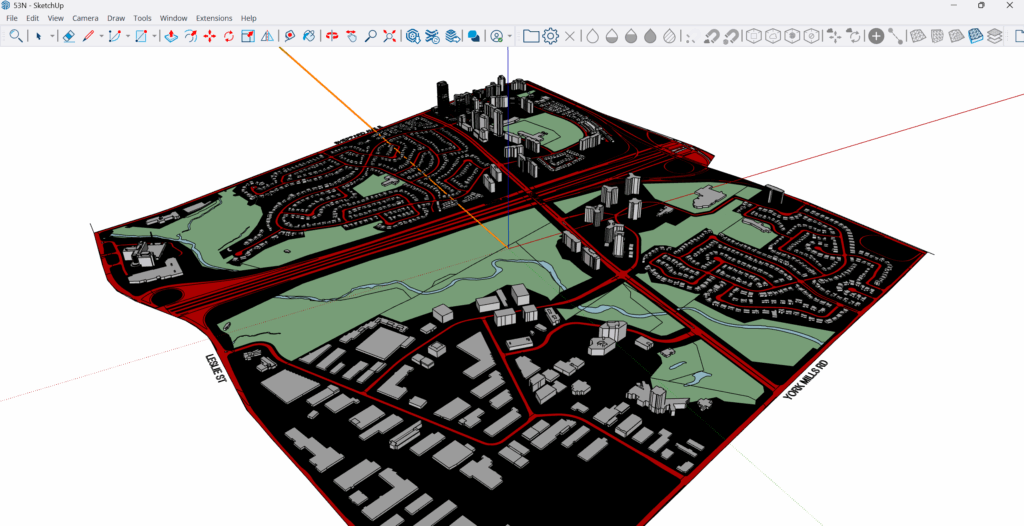 To import into SketchUp, the downloaded SketchUp files of Toronto neighborhood boundaries that were downloaded earlier were used in this stage. Each file must be downloaded separately. Identifying each section was done through the labels that were automatically applied.