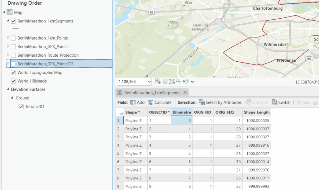 - The workflow for this project began with extensive preprocessing of GPS track data sourced from public Strava activities. Each GPX file was inspected, cleaned, and converted into usable spatial geometry and re-projecting all layers into city-appropriate projected coordinate reference systems. The fields were then calculated for pace per kilometre, elevation gain per kilometre, maximum slope, and mean slope, using a combination of the Generate Points Along Lines, Split Line at Measure, and Add Surface Information tools.