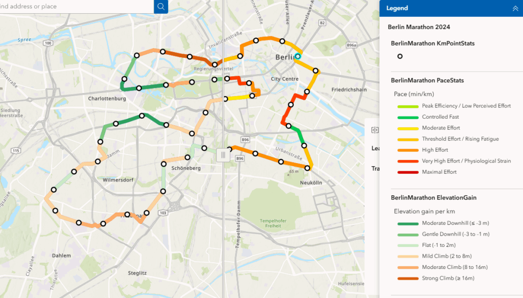 - The visualization design was the main cornerstone of the project’s approach. Thus, race maps employed accessible, easy-to-comprehend gradients to represent sequential variables such as pace, slope, and elevation gain, while the dashboard created through Experience Builder enabled dynamic comparison across the three cities.
