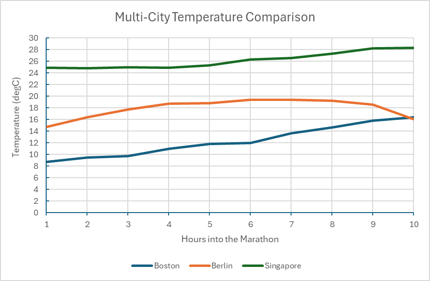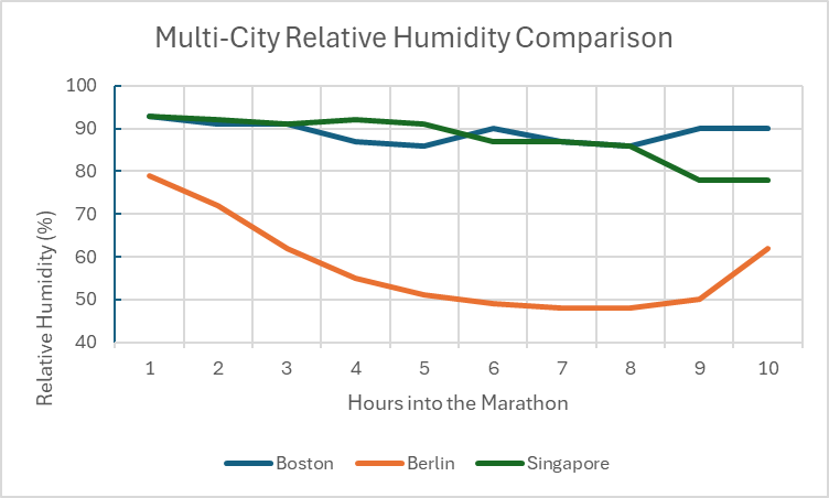 - This integration of hourly weather data highlights how climate interacts with geography to shape athletic effort. Berlin demonstrates ideal running conditions having cool and stable temperature along with stable wind speeds, which makes sense of the fast, consistent pacing. Boston shows slightly more variable weather, perhaps being on the New England Coast, Singapore saw the most influential weather impact with the humidity exceeding 80% for majority of the race (Figure 5) and persistent hot temperatures even throughout the night before.
